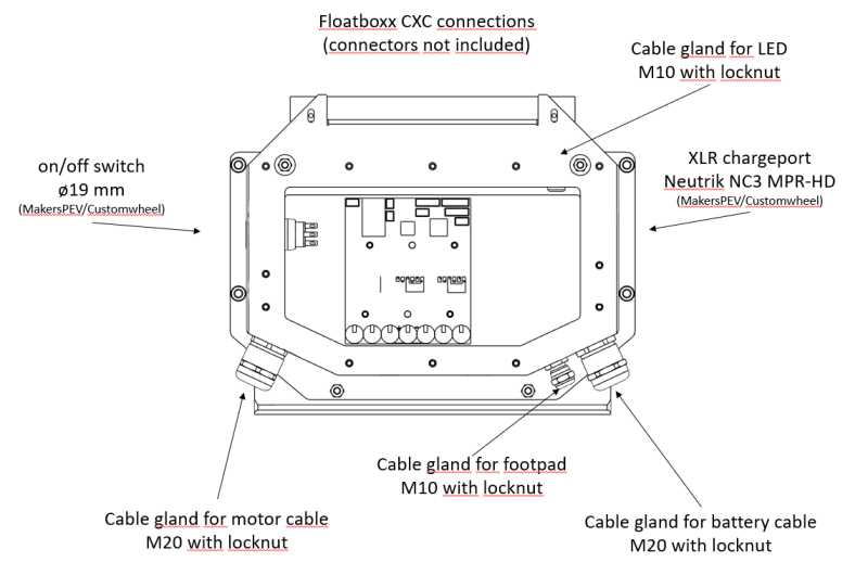 - charge plug: ø20,5 mm hole for the Neutrik NC3 MPR-HD XLR (Pre-wired available from MakersPEV/Customwheel)