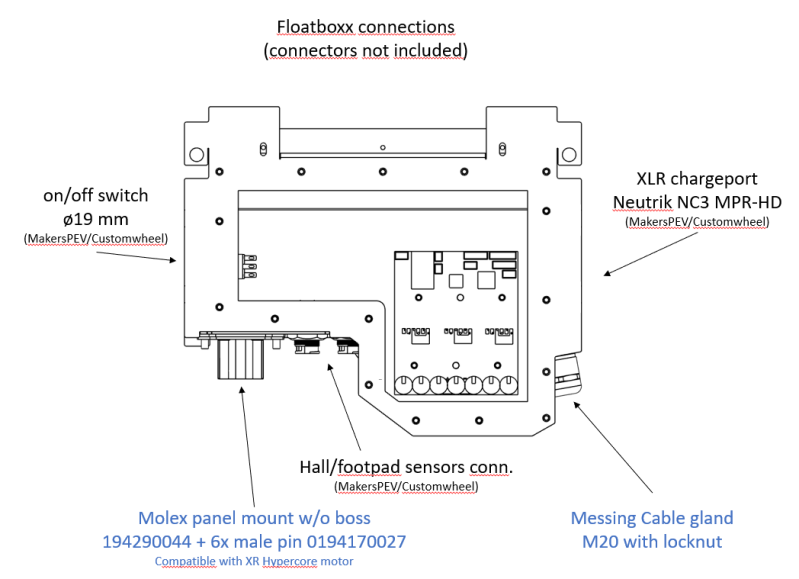- Buy a pre-wired Floatboxx set from Customwheel.shop for 24,79 € including the motor connector, M20 Cable gland and their compatible internal charger connector. Or contact us for a USA supplier.